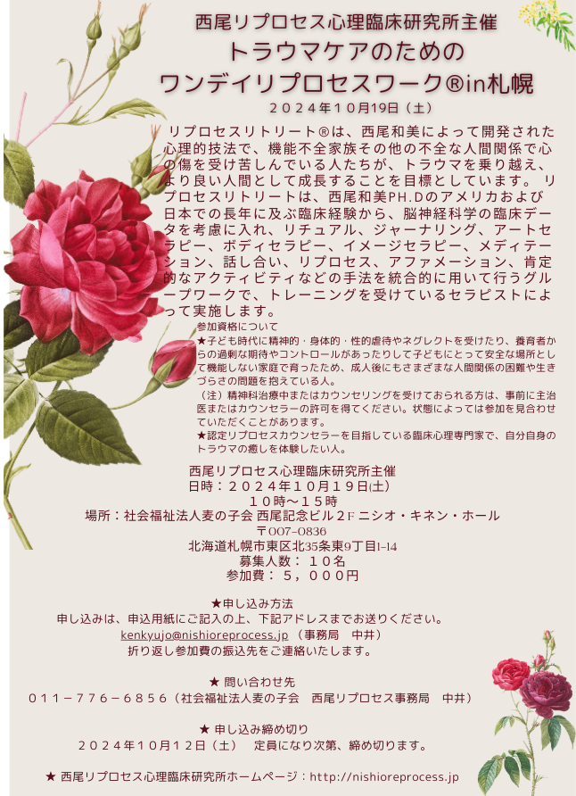 ※トラウマケアのためのワンデイリプロセスワーク®2024年10月19日 https://nishioreprocess.jp/wp-cont...続きを読む